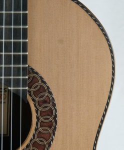 Die Gitarre ist schön mit vielen Randeinlagen und Intarsien. Die Gitarre hat eine Schellackpolitur und. Schauen Sie sich das Video an, wenn Sie sich von der Qualität überzeugen wollen.
