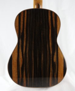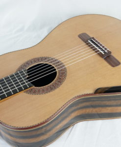Andreas Madimenos ist ein Gitarrenbauer, der die Gitarren von Greg Smallman & Sons bewundert. Er hat sich daher von einigen Elementen des australischen Gitarrenbaus inspirieren lassen (stark strukturierter Boden und Zargen, dünne Decke, innere Zarge, Form der Zarge), aber auch eigene Elemente entwickelt. Diese Gitarre wurde 2023 gebaut und diente in seiner Werkstatt als Benchmark und Vergleichspunkt mit den später gebauten Instrumenten. Diese Nummer 66 ist nun also zur Freude des zukünftigen Käufers erhältlich.