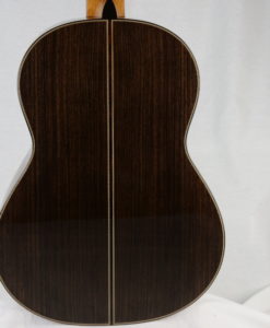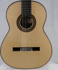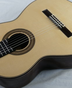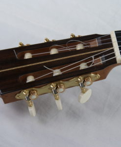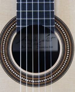 Sein Gitarrenbau ist von Antonio Torres inspiriert, insbesondere vom Modell Torres SE 114 aus dem Jahr 1888. Die Materialien sind von höchster Qualität und der Geigenbau von großer Präzision. Die Rosette ist wunderschön und die Wahl der weißen Alessi-Light-Mechaniken unterstreicht die Eleganz dieser Gitarre.