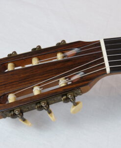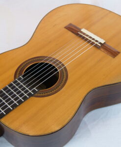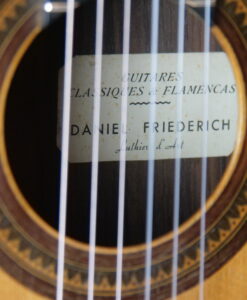 Eine einmalige Gelegenheit, eine Daniel Friederich aus dem Jahr 1955/1960 zu erwerben, die für Jeanne Bidaud (1927-2017), Malerin und klassische Gitarristin, angefertigt wurde. Diese Gitarre hat ein Etikett ohne die Adresse der Werkstatt und wurde daher zwischen 1955, dem Gründungsjahr der Werkstatt Friederich, und 1960 hergestellt. Erst nach 1960 kamen die Modelle Concert, Arpège und Récital auf den Markt. Diese „Jeanne Bidaud”-Gitarre ist weder ein Récital- noch ein Arpège-Modell, sondern das Gitarrenmodell, das Daniel Friederich zu dieser Zeit herstellte. Die Gitarre wurde perfekt gepflegt. Diese Gitarre, die den Gitarren von Robert Bouchet ähnelt, überrascht durch ihre Kraft und ihren schönen Klang.