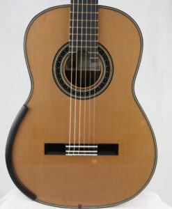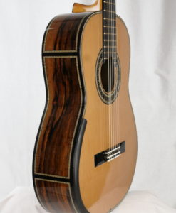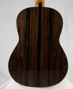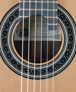 Meine Gitarren profitieren von einer halbmondförmigen – lattice – Zarge, sind aber eigentlich ziemlich weit von australischen Gitarren entfernt. Der Rücken ist traditionell aus Massivholz und nicht aus Melamin oder gewölbt wie bei australischen Gitarren, damit er eine aktive Rolle spielen kann. Die Zargen sind gefüttert, um den Energieverlust zu verringern. Die Decke ist relativ dick mit verjüngten Teilen. Der Damm soll einen hohen Schallpegel erzeugen und die warme Farbe der europäischen Gitarren erhalten. Meine Gitarren zeichnen sich durch einen imposanten Bass (Cellobass) aus, rund und voll mit einer beeindruckenden Notenhaltung. Die Resonanzen der Gitarre liegen zwischen 69hz und 168hz. Mit Kupfersätteln – die die Arbeitszeit um das Zehnfache erhöhen – lässt sich die Klangqualität noch steigern.
