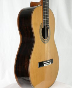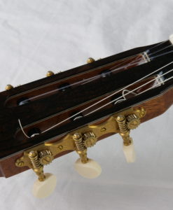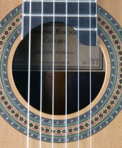 Wie Sie wissen, sind wir große Fans von modernen Doppeldecker- und Lattice-Gitarren. Warum wir also eine Fleta-Kopie in unserem Showroom listen: Ganz einfach, weil wir von der Ignacio Fleta-Kopie von Domenic Roscioli völlig überwältigt waren. Wenn Sie Gitarrenbauer nach Gitarren fragen, die in der Geschichte des Gitarrenbaus eine Rolle gespielt haben, werden alle ohne Ausnahme Ignacio Fleta (1897-1977) nennen. Ignacio Fleta wurde 1957 berühmt, als Andrés SEGOVIA bei ihm eine und später mehrere Gitarren in Auftrag gab. Seitdem spielen unzählige weltberühmte Solisten auf seinen Gitarren. Er starb 1977 als weltweit anerkannter und geehrter Handwerker, und seine Söhne Gabriel und Francisco folgten ihm nach. Diese Firma baut weiterhin Gitarren, die bei Musikern sehr gefragt sind, und, nunmehr von Ignacios Enkel Gabriel jr. geführt, gibt sie nunmehr 20 Jahre Verzögerung zwischen der Bestellung einer Gitarre und ihrer Auslieferung an…Domenic bietet uns hier eine Neuauflage des Modells Fleta von 1961 mit einem Boden und Zargen aus Pardo Rosewood und einer wunderschönen Zederndecke. Der Klang ist majestätisch und elegant, mit der richtigen Klangbalance Bass und Höhen.So spricht Domenic Roscioli über seine Leidenschaft für die Fleta: « Als ich mit dem Bau von Konzertgitarren begann, wollte ich traditionelle Gitarren bauen, die den schönsten Klang bieten, den ich mir vorstellen konnte. Der Klang der Gitarren von Ignacio Fleta hat mich von allen Gitarren, die ich je gehört habe, immer am meisten beeindruckt. Ich kannte einen Sammler in Adelaide, der fünf originale Fleta-Gitarren besaß, und ich hatte die Pläne von drei dieser Gitarren (1961, 1968, 1977). Der Plan der 1961er war mein Favorit, da die Gitarre zweifellos die beste von allen war. Außerdem hatte ich die Gelegenheit, bei Reparaturen an einer Reihe von Fleta-Gitarren zu arbeiten, die ich gründlich studierte. Meine Fleta-Gitarren sind von Fleta-Gitarren aus der Zeit zwischen 1960 und 1970 inspiriert, die für mich die beste Zeit war.Anfangs hielt ich mich genau an die Angaben in den Zeichnungen (gleiche Größe, gleiche Dicke, ähnliches Holz), mit sehr überzeugenden Ergebnissen.Jetzt bewerte ich jede Decke, um den besten « Fleta-Sound » zu erzielen. Ich verwende ausschließlich Fichtendecken aus Master Grade. Die Suche nach den besten Materialien für den besten Klang ist eine endlose Suche.Im Allgemeinen suche ich nach soliden, kräftigen Bässen mit klaren Höhen. « Abdruck aus Ausgabe 181 :