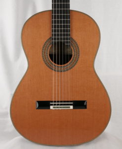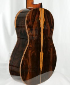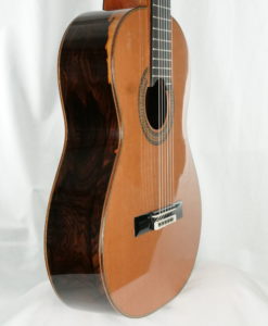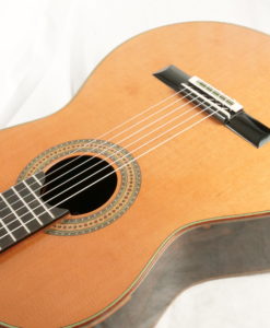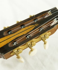 Wie Sie wissen, sind wir große Fans von modernen Doppeldecker- und Lattice-Gitarren. Warum wir also eine Fleta-Kopie in unserem Showroom listen: Ganz einfach, weil wir von der Ignacio Fleta-Kopie von Domenic Roscioli völlig überwältigt waren. Wenn Sie Gitarrenbauer nach Gitarren fragen, die in der Geschichte des Gitarrenbaus eine Rolle gespielt haben, werden alle ohne Ausnahme Ignacio Fleta (1897-1977) nennen. Ignacio Fleta wurde 1957 berühmt, als Andrés SEGOVIA bei ihm eine und später mehrere Gitarren in Auftrag gab. Seitdem spielen unzählige weltberühmte Solisten auf seinen Gitarren. Er starb 1977 als weltweit anerkannter und geehrter Handwerker, und seine Söhne Gabriel und Francisco folgten ihm nach. Diese Firma baut weiterhin Gitarren, die bei Musikern sehr gefragt sind, und, nunmehr von Ignacios Enkel Gabriel jr. geführt, gibt sie nunmehr 20 Jahre Verzögerung zwischen der Bestellung einer Gitarre und ihrer Auslieferung an…Domenic bietet uns hier eine Neuauflage des Modells Fleta von 1961 mit einem Boden und Zargen aus Pardo Rosewood und einer wunderschönen Zederndecke. Der Klang ist majestätisch und elegant, mit der richtigen Klangbalance Bass und Höhen.So spricht Domenic Roscioli über seine Leidenschaft für die Fleta: « Als ich mit dem Bau von Konzertgitarren begann, wollte ich traditionelle Gitarren bauen, die den schönsten Klang bieten, den ich mir vorstellen konnte. Der Klang der Gitarren von Ignacio Fleta hat mich von allen Gitarren, die ich je gehört habe, immer am meisten beeindruckt. Ich kannte einen Sammler in Adelaide, der fünf originale Fleta-Gitarren besaß, und ich hatte die Pläne von drei dieser Gitarren (1961, 1968, 1977). Der Plan der 1961er war mein Favorit, da die Gitarre zweifellos die beste von allen war. Außerdem hatte ich die Gelegenheit, bei Reparaturen an einer Reihe von Fleta-Gitarren zu arbeiten, die ich gründlich studierte. Meine Fleta-Gitarren sind von Fleta-Gitarren aus der Zeit zwischen 1960 und 1970 inspiriert, die für mich die beste Zeit war.Anfangs hielt ich mich genau an die Angaben in den Zeichnungen (gleiche Größe, gleiche Dicke, ähnliches Holz), mit sehr überzeugenden Ergebnissen.Jetzt bewerte ich jede Decke, um den besten « Fleta-Sound » zu erzielen. Ich verwende ausschließlich Fichtendecken aus Master Grade. Die Suche nach den besten Materialien für den besten Klang ist eine endlose Suche.Im Allgemeinen suche ich nach soliden, kräftigen Bässen mit klaren Höhen. « Abdruck aus Ausgabe 181 :