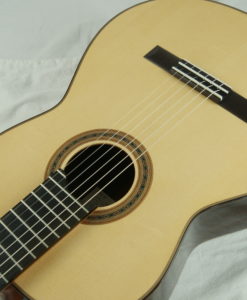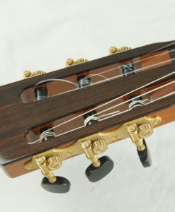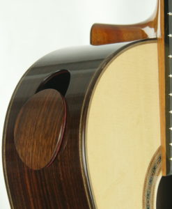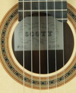 Einmal ist keinmal! Hier ist eine Gitarre mit einer sehr traditionellen Zargenkonstruktion, die von dem kanadischen Gitarrenbauer Douglass Scott gebaut wurde. Douglass baut Gitarren mit kristallklaren Höhen und einer beeindruckenden Dynamik und Klangamplitude, die mit den besten Lattice- oder Double-Table-Gitarren mithalten können. Kurz gesagt, diese Gitarre von Douglass Scott bietet einfach einen größeren Tonumfang, mehr Sustain, dickere Noten und mehr Höhen. Für diese Gitarre Nr. 132 haben wir Douglass gebeten, eine Armauflage, einen verstellbaren magnetischen Soundport und Alessi-Mechaniken zu integrieren. Zweifellos eine der besten traditionellen Gitarren.