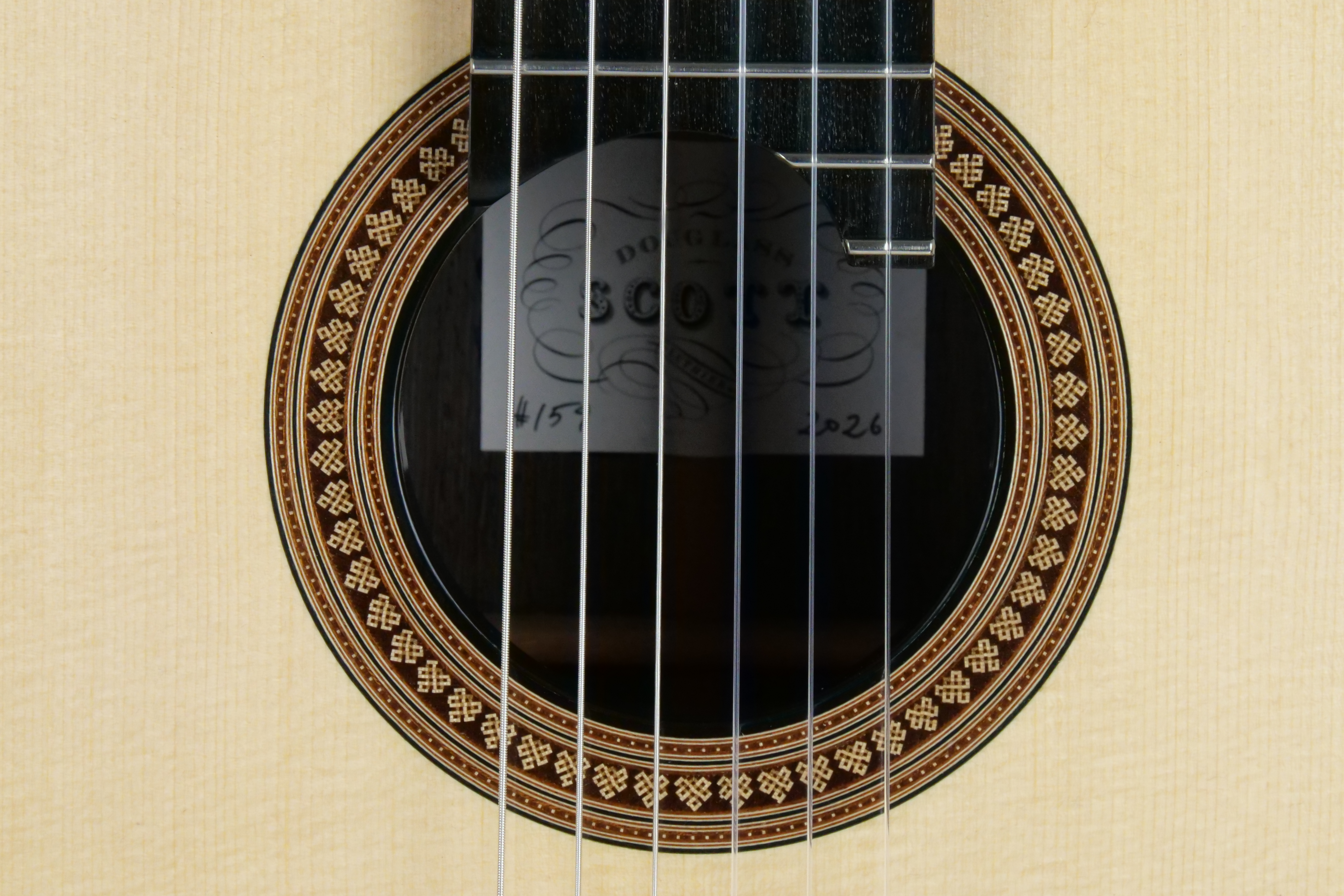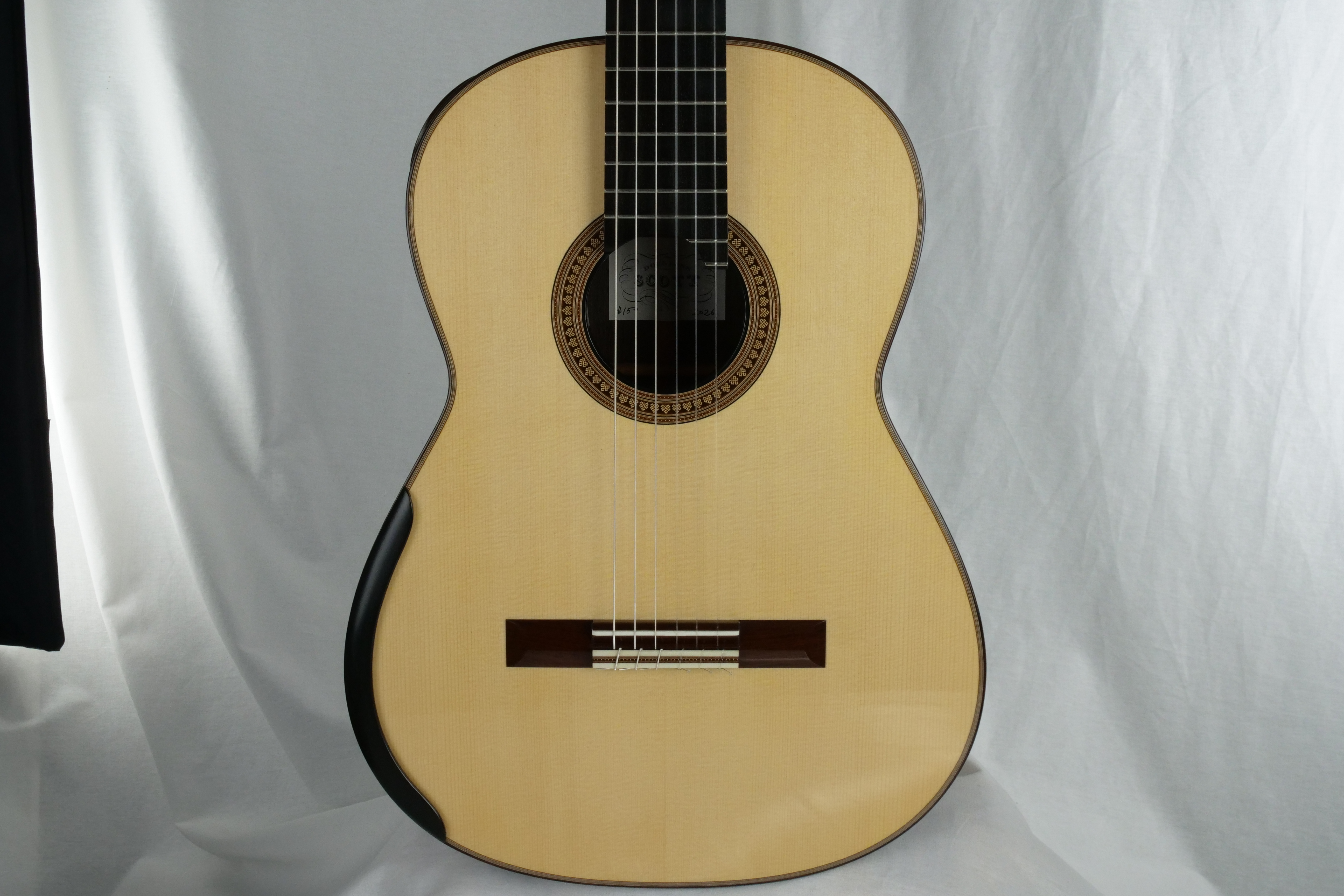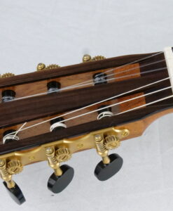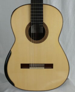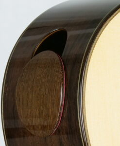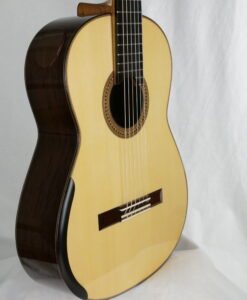 For a change: here is a traditional braced guitar from a fantastic Canadian builder Douglass Scott. Douglass makes traditional guitars with a crystal-clear sound and great dynamics. What are his guitars offering: simply a broad tonal palette, increased sustain, increased warmth, deeper bass, and more present trebles. This No 1529 comes with the following options, an armrest, Alessi tuners, a sound port with a magnetic cover and most importantly a spruce top which brings a complex sound.