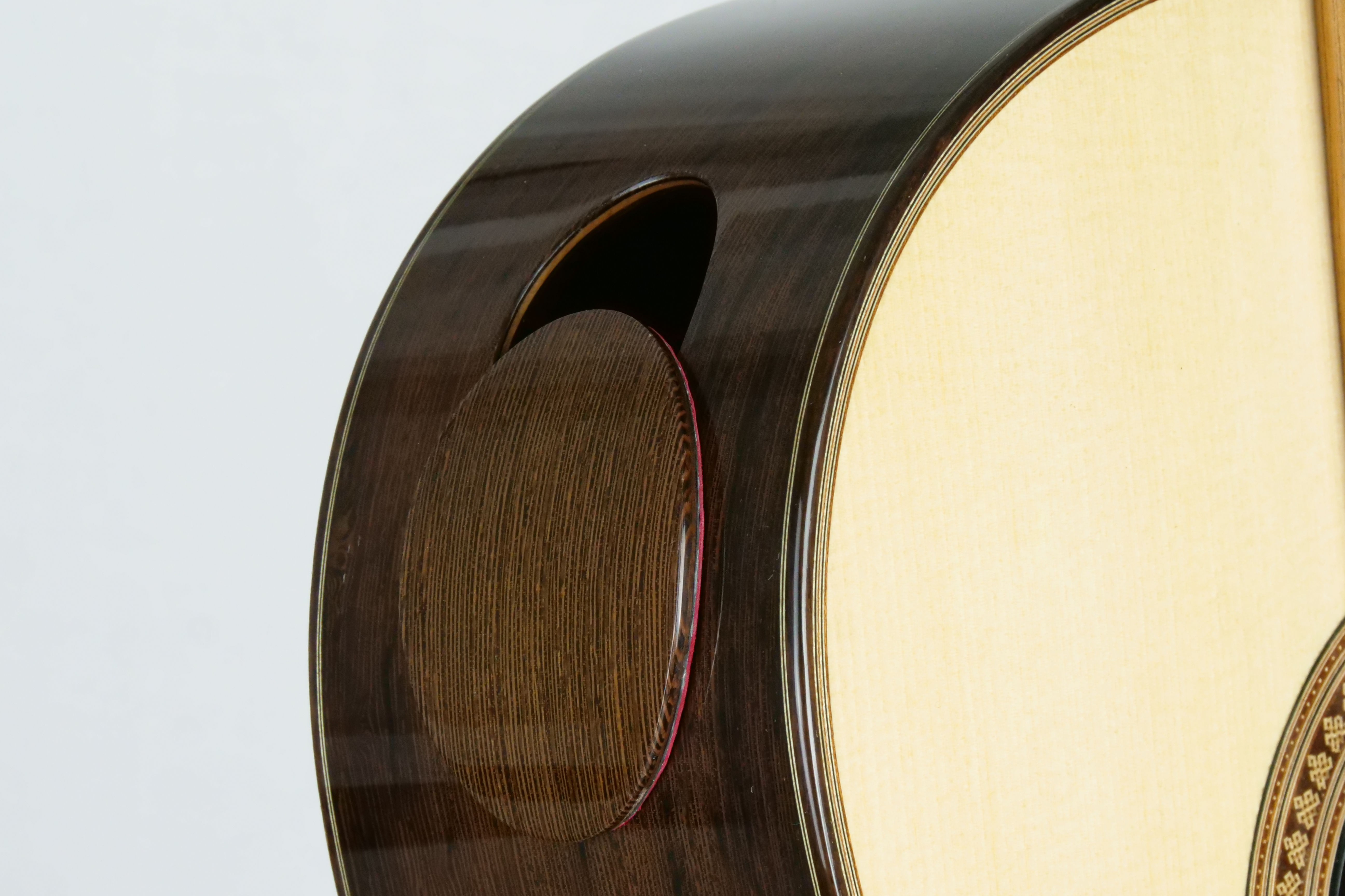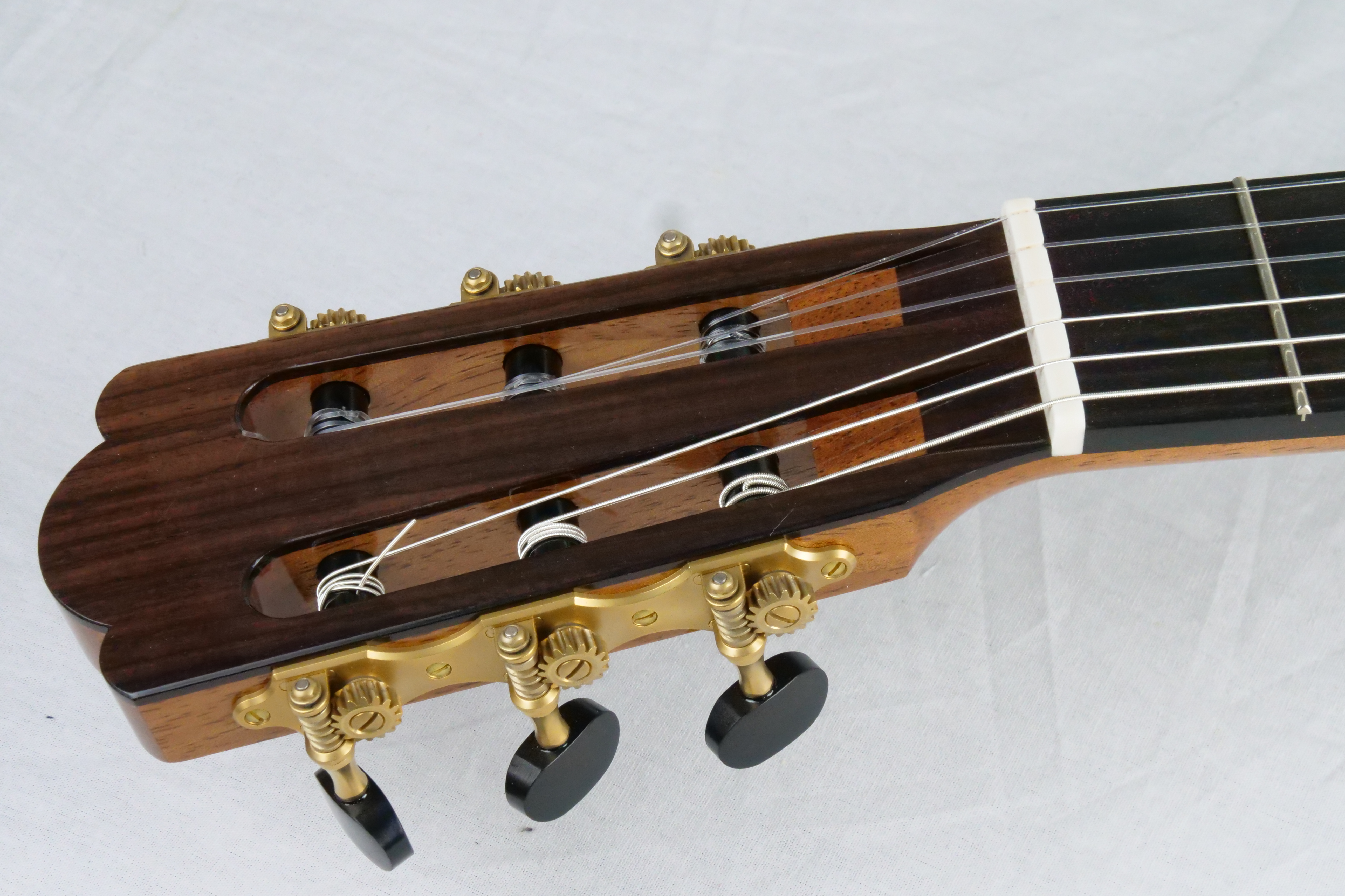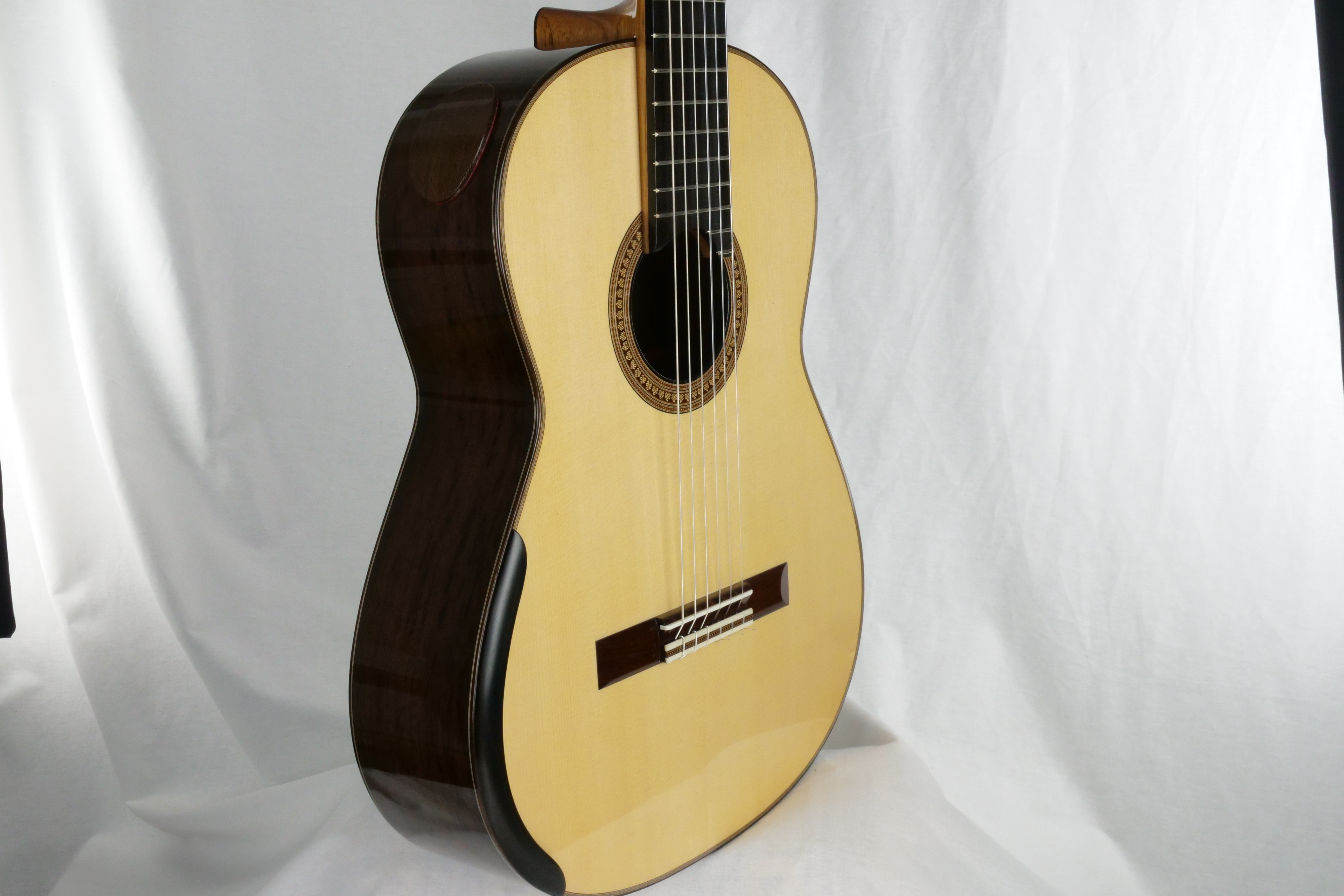 For a change: here is a traditional braced guitar from a fantastic Canadian builder Douglass Scott. Douglass makes traditional guitars with a crystal-clear sound and great dynamics. What are his guitars offering: simply a broad tonal palette, increased sustain, increased warmth, deeper bass, and more present trebles. This No 1529 comes with the following options, an armrest, Alessi tuners, a sound port with a magnetic cover and most importantly a spruce top which brings a complex sound.