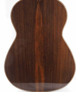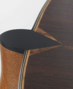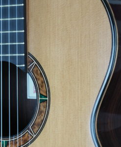 Wieder einmal haben wir den deutschen Gitarrenbauer Philipp Neumann gebeten, eine Gitarre für unseren Showroom anzufertigen. Einzig der Name dieser Konzertgitarre ist traditionell, denn sie ist das Ergebnis einer umfangreichen Überarbeitung des Resonanzbodens. Ziel ist es, mit den Lattice- und Double-Top-Gitarren in Bezug auf Klangvolumen zu rivalisieren. Dennoch wirkt der traditionelle Klang umfangreich und majestätisch. Außerdem werden eine gewisse Breite und die holzigen Klangeigenschaften bewahrt. Die Beleistung ist traditionell und die so unterstützte Decke gewährleistet verstärkte Vibrationen und somit ein größeres Klangvolumen. Die Decke aus Zedernholz ist innen ausgehöhlt und zur Verstärkung mit Streben (ebenfalls aus Zedernholz) ausgestattet, ohne das Instrument jedoch zu beschweren. Die Verarbeitung dieser Gitarre ist von großer Qualität. Überdies verwendet Philipp Neumann Malachitsteine um seine Rosette zu verzieren.