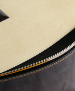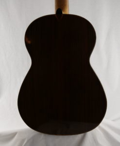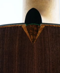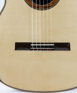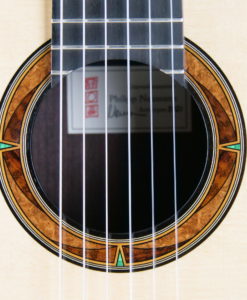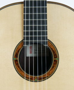 Wieder einmal haben wir den deutschen Gitarrenbauer Philipp Neumann gebeten, eine Gitarre für unseren Showroom anzufertigen. Einzig der Name dieser Konzertgitarre ist traditionell, denn sie ist das Ergebnis einer umfangreichen Überarbeitung des Resonanzbodens. Ziel ist es, mit den Lattice- und Double-Top-Gitarren in Bezug auf Klangvolumen zu rivalisieren. Dennoch wirkt der traditionelle Klang umfangreich und majestätisch. Außerdem werden eine gewisse Breite und die holzigen Klangeigenschaften bewahrt. Die Beleistung ist traditionell und die so unterstützte Decke gewährleistet verstärkte Vibrationen und somit ein größeres Klangvolumen. Die Decke aus Fichtendecke ist innen ausgehöhlt und zur Verstärkung mit Streben (ebenfalls aus Zedernholz) ausgestattet, ohne das Instrument jedoch zu beschweren. Die Verarbeitung dieser Gitarre ist von großer Qualität. Überdies verwendet Philipp Neumann Malachitsteine um seine Rosette zu verzieren.