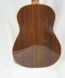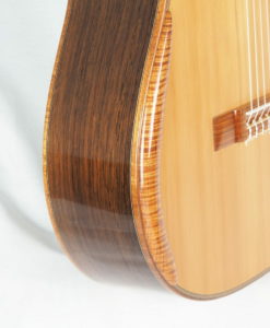 Die großartige Zederndecke erstrahlt im Glanz, der Boden und die Zargen sind aus australischem Schwarzholz, Sassafras oder ostindischem Palisander. Der Hals ist australische Zeder, Schaller Mechaniken, Steg aus Padouk, der Kopf mit Verzierungen aus Schwarzholz. Alle Hölzer stammen aus Australien. Graham Caldersmith hat in jahrelanger physikalisch-akustischer Forschung herausgefunden, dass diese Hölzer seinen klanglichen Vorstellen am besten entsprechen.
