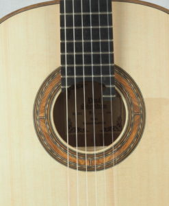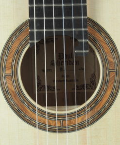 Paul Sheridans klassische Gitarren von über 3 kg sind typisch für die australische Lattice-Gitarrenbauerarbeit. Rücken und Zargen aus Laminat und eine sehr dünne Decke innen verstärkt durch Balsaholz und Latticebeleistung / / Sprossen. Diese klassische Gitarre mit Kiefernholzdecke gehört ganz klar zu den Greg Smallman-Lattice-Gitarren, auch wenn sie natürlich trotzdem ihre eigene Persönlichkeit besitzt.