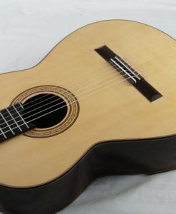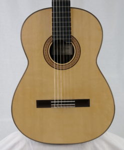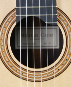 Michael Cadiz ist ein Gitarrenbauer mit amerikanischen Wurzeln, der seit 2016 in Graz in Österreich lebt. Er baut traditionelle Gitarren, die von Romanillos, Hauser und Torres inspiriert sind, und bietet uns hier ein Concert-Modell an, das das Know-how vieler Gitarrenbauer vereint. Dieses Modell No 91 ist ein Concert-Modell, das sich an der Tradition mit einer gewissen Modernität orientiert und die Innovationen vieler Gitarrenbauer vereint. Die Gitarre ist leicht mit einer traditionellen, leichteren Zarge, die von dünnen Querbalken durchzogen ist. Die Bässe sind überraschend tief und kräftig mit kristallklaren, sehr hohen ‘Fichten’-Höhen. Die Gitarre hat keine Fehler und klingt klassisch.