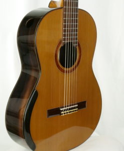 Dies ist eine klassische Gitarre lattice, die von einem französischen Gitarrenbauer hergestellt wurde. Régis Sala ist ein französischer Gitarrenbauer, der klassische Gitarren mit den rein französischen traditionellen klassischen Gitarrenmethoden baut. Régis hat sich jedoch entschlossen, für uns seine eigene Vision einer klassischen Gittergitarre zu bauen, die das Beste aus beiden Welten, der Gittergitarre und der traditionellen Gitarre, kombiniert. Das Ergebnis ist erstaunlich: langes Sustain und schöner Ton.