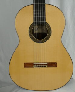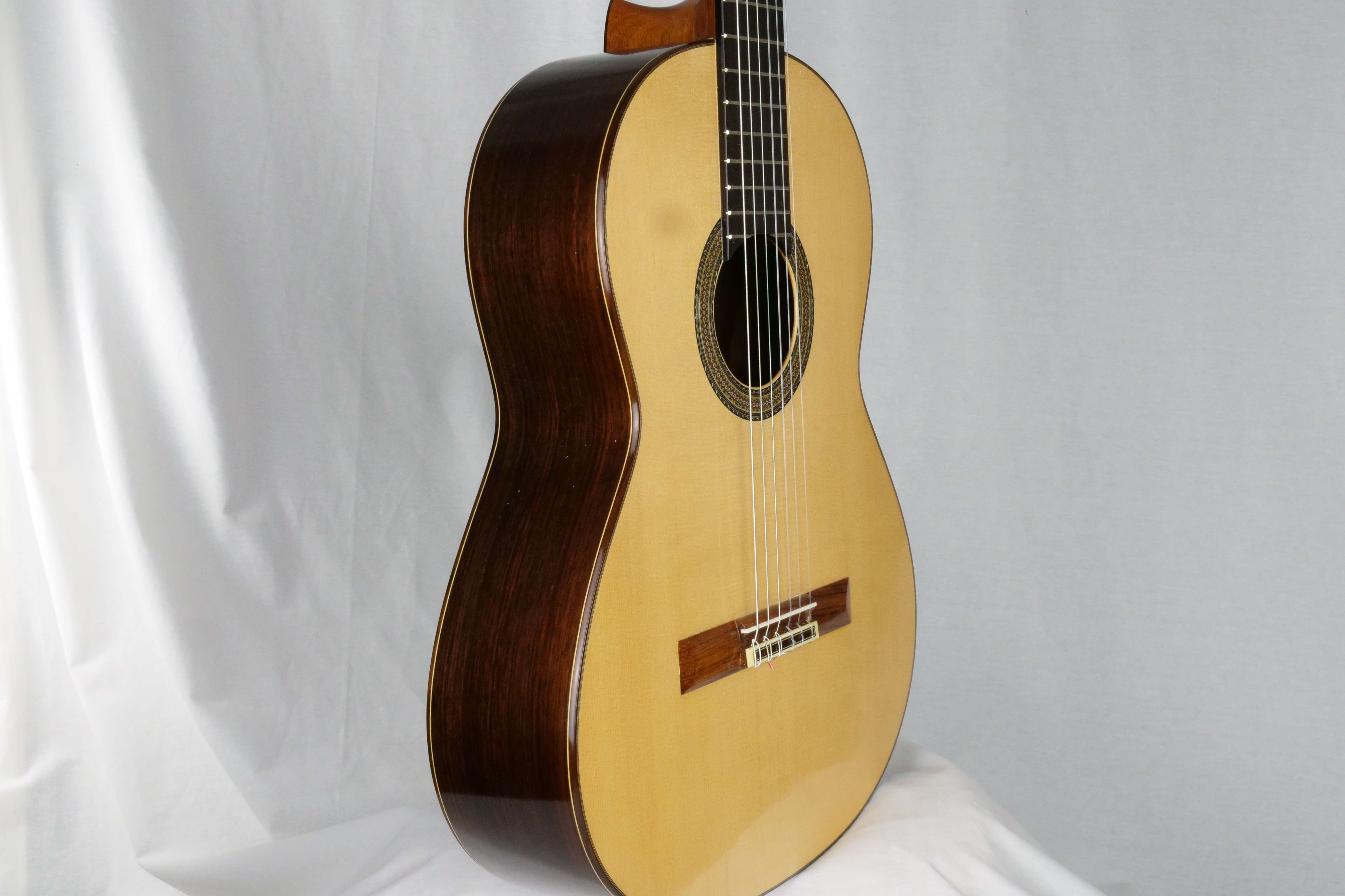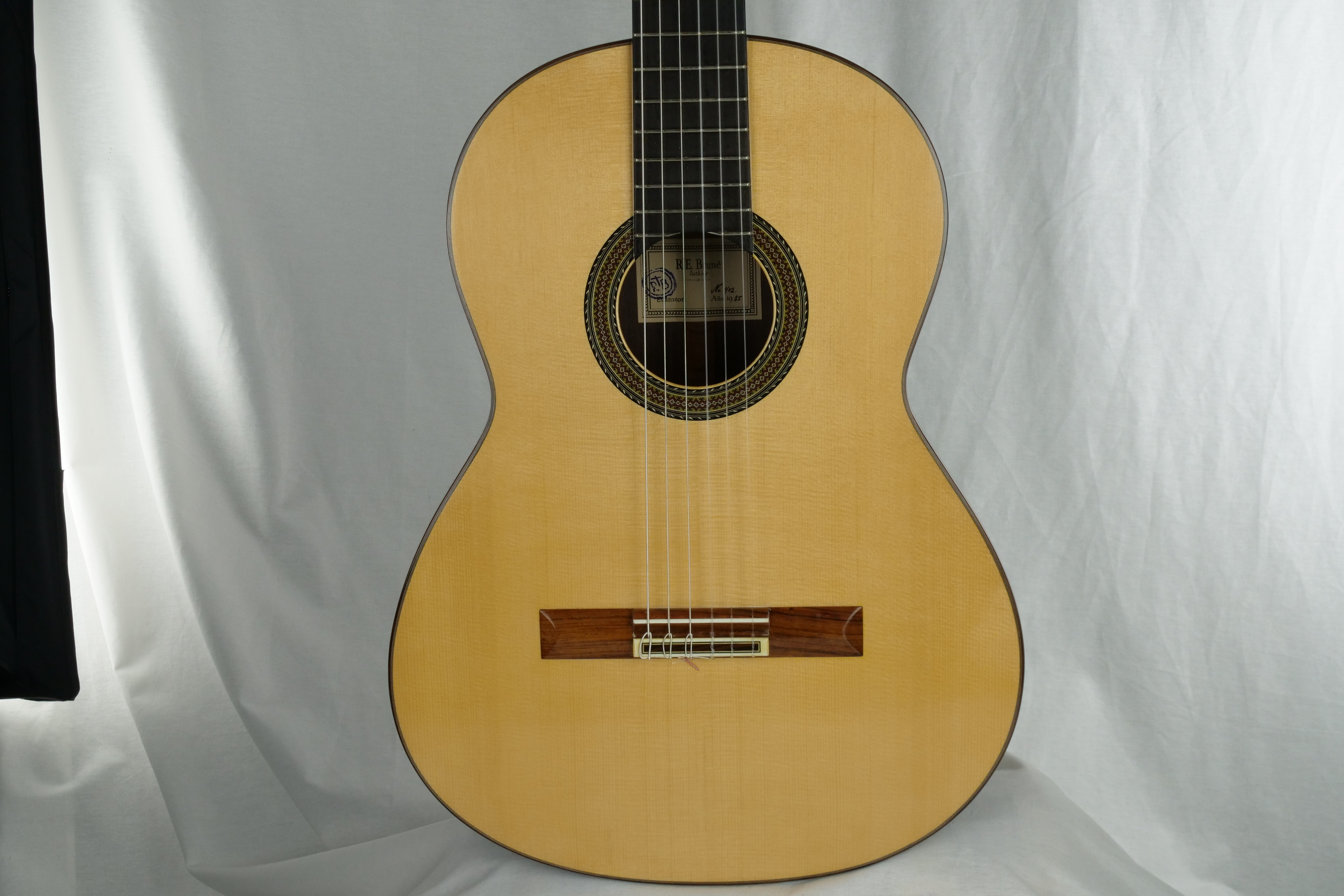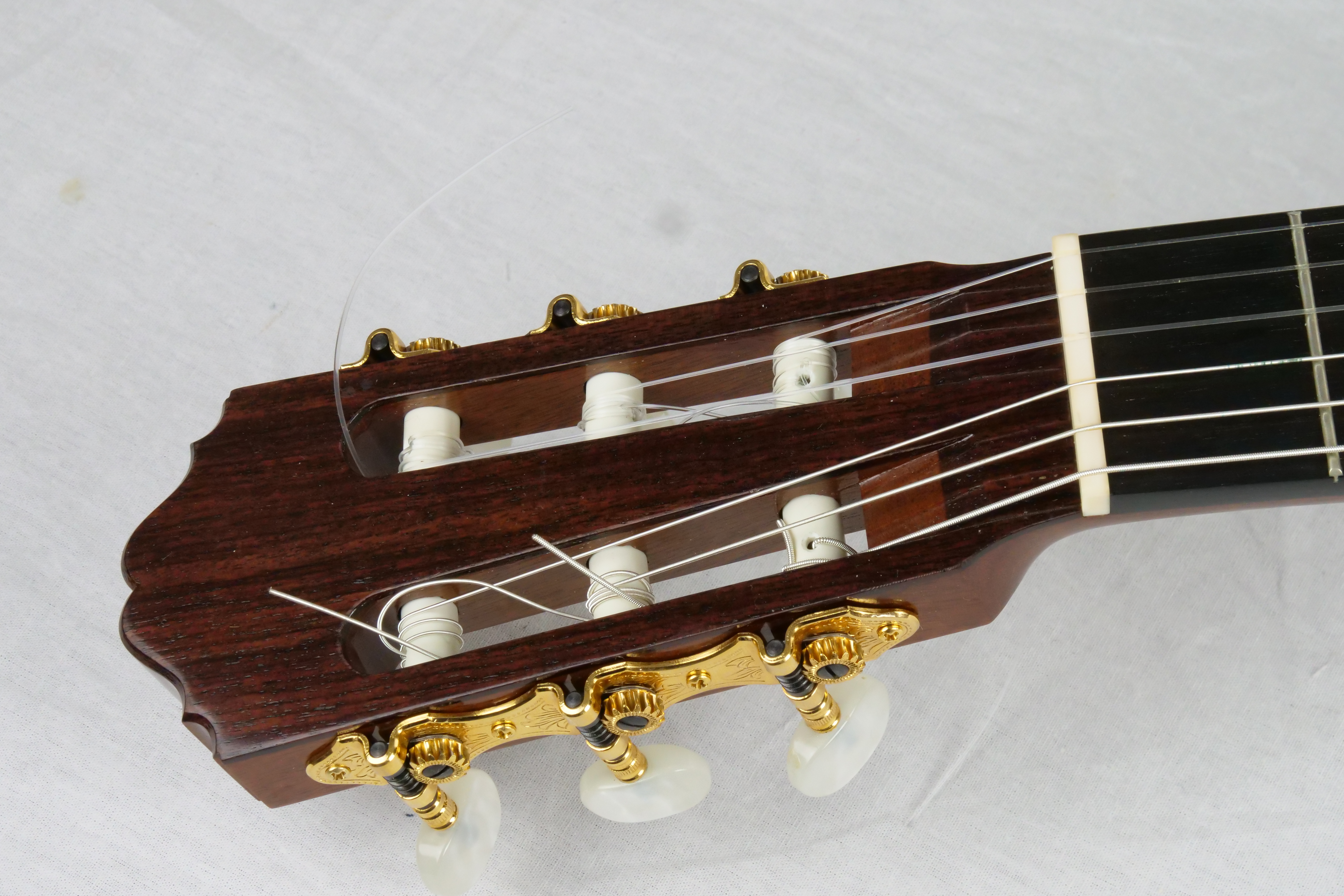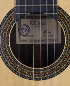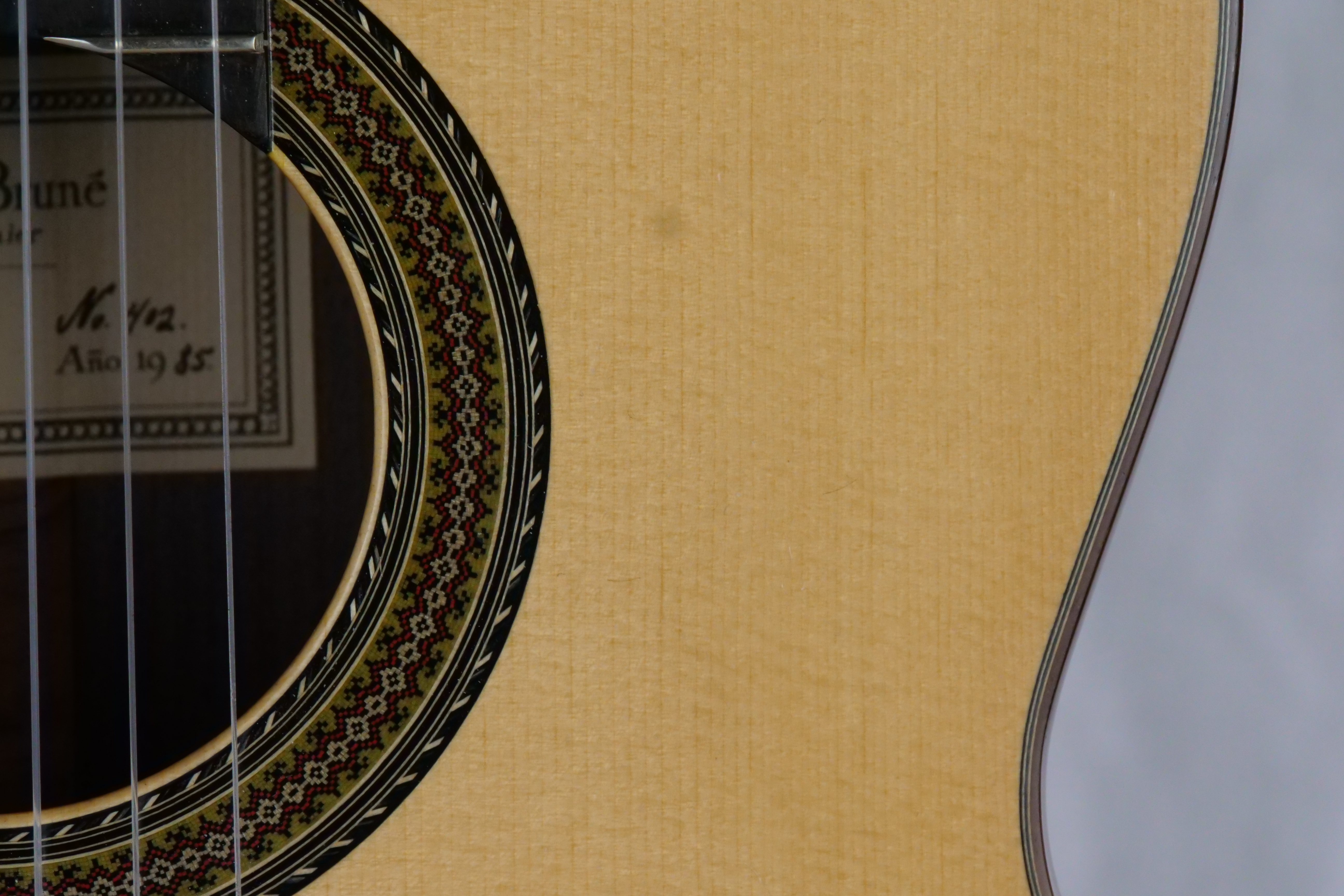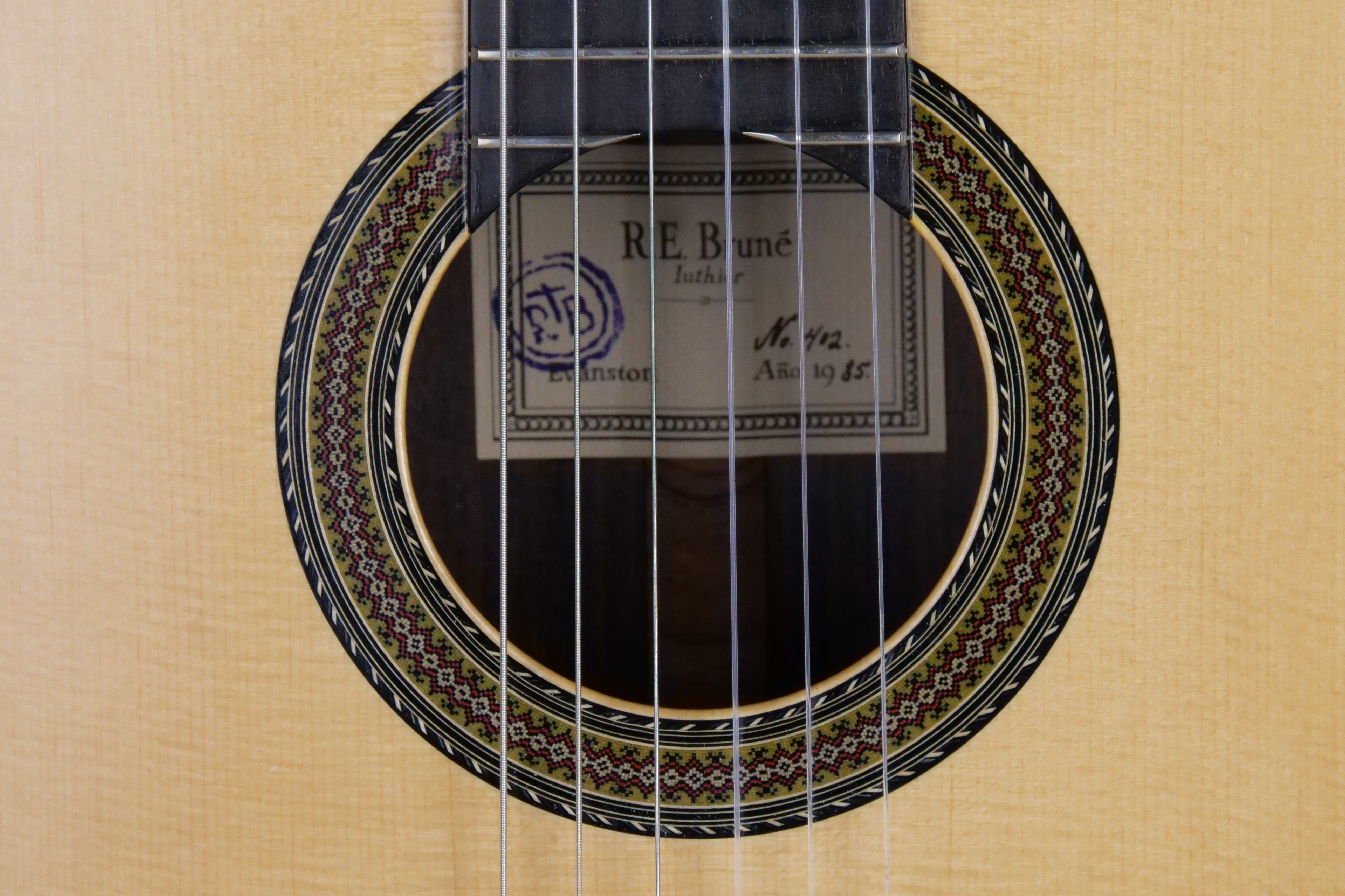 Hier ist eine seltene Gitarre: eine Richard E. Bruné aus Fichte und indischem Palisander von 1985. Richard Bruné ist einer der führenden Namen im traditionellen Gitarrenbau in Amerika. Diese Gitarre, Nr. 402, erinnerte uns an eine Hauser oder eine Romanillos. Richard Bruné hat eine gut dokumentierte Studie über die Hauser II von 1937 veröffentlicht, die André Ségovia gehörte. 1986, ein Jahr vor seinem Tod, erhielt André Ségovia die Richard-Bruné-Gitarre Nr. 418, die der Hauser von 1937 nachempfunden war. Für Gitarrenliebhaber von einem großen Meister des amerikanischen Gitarrenbaus.