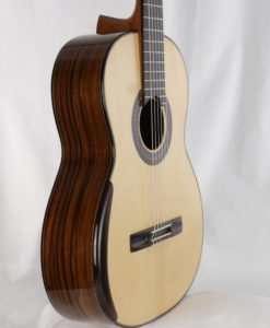 Fichtendecke und Zargen und Boden aus südamerikanischem Pau Ferro. Sie überflutet mit ihrer Klarheit und ihren warmen Mitten. Die große Stärke des radialen Damms – Sustain und Stimmtrennung – wird durch warme Mitteltöne ergänzt. Ein Geigenbau, der dem von Simon Marty ähnelt: eine wunderbare Klangdefinition.