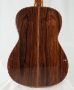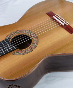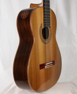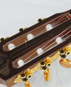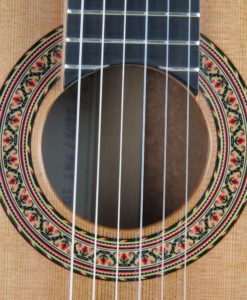 Die neue Gitarre Nr. 186 ist eine doubletop, die Nomex verwendet, was für Vasilis seit der Gitarre Nr. 170 eine Neuheit ist. Das Ergebnis: Die Gitarre hat an Dynamik gewonnen, mit mehr Kraft, Sustain und harmonischen Resonanzen. Man findet das, was Vasilis’ Markenzeichen ist: einen runden, warmen Klang. Ein erstklassiger Gitarrenbau und ein schöner Klang wie gewohnt! Vasilis misst auf klanglicher Ebene alle Elemente der Konstruktion, um auf die richtige Frequenz zu kommen. Wir müssen zugeben, dass wir die DT-Gitarren von Vasilis als gleichwertig mit den besten deutschen DTs betrachten.Doppelte Decke: Zeder/ Nomex/ ZederRücken und Zargen aus indischem Palisander und Dubbing aus afrikanischem Mahagoni – Khaya ivorensis.Griffbrett aus afrikanischem EbenholzFrench Shellac – Stempellack- für die Decke und synthetisches Öl für den Korpus.Mechanik: Grover 306G Delux Hauser Gold