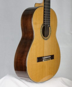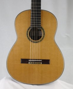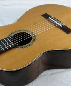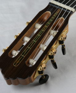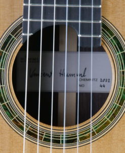 Hier ist die neue Double-top Nr. 44 von 2022 von Vincent Humml, die sich von der Nr. 45 durch das Zedernholz unterscheidet, das als Außenholz verwendet wird. Diese Gitarre ist einen Schritt weiter als die Original-Doppel-Tops, die in Deutschland von Gernot Wagner und Matthias Dammann in den 80er Jahren hergestellt wurden. Der Klang ist rein, laut, sehr dick und elegant. Die Gitarre erzeugt einen dreidimensionalen Klang, der erstaunlich ist.